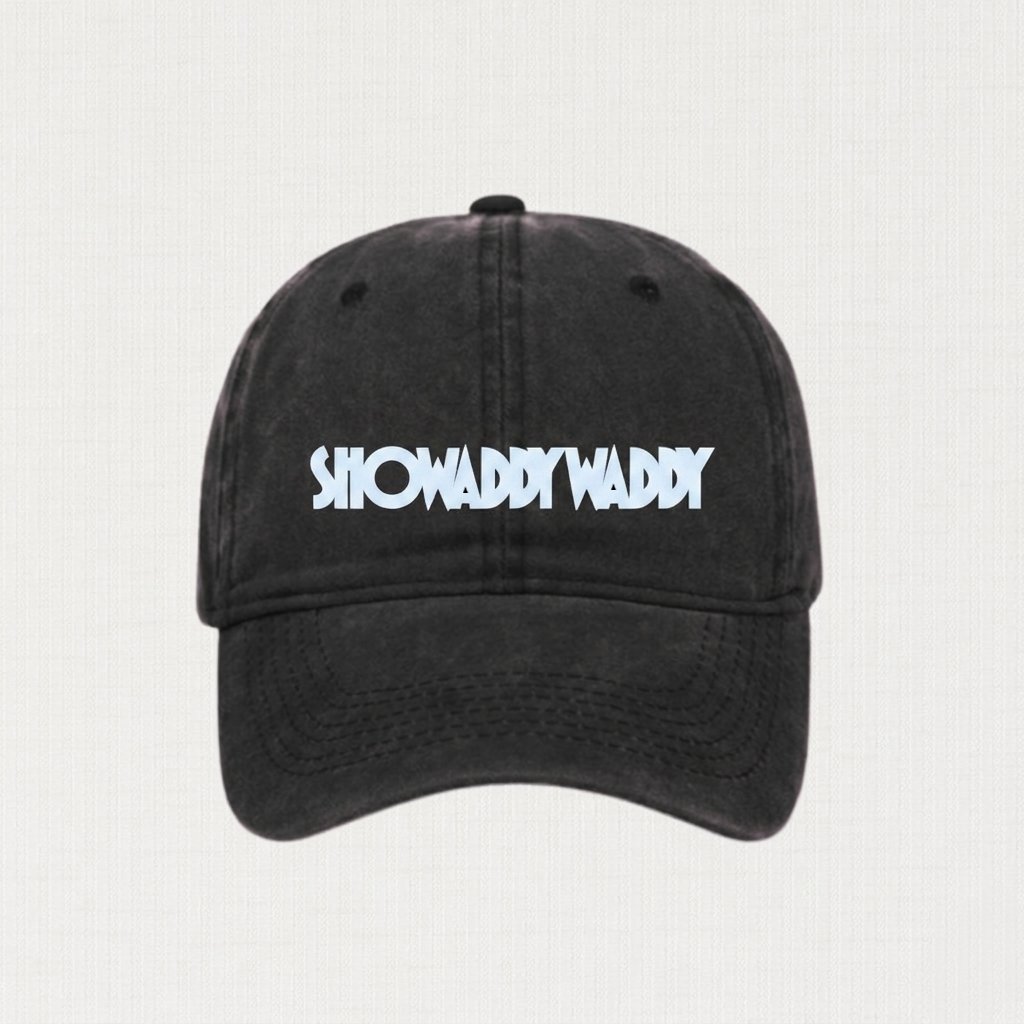 Top off your look with our signature 'Showaddywaddy' washed black cap. Crafted from soft, breathable cotton with a vintage-washed finish, this cap adds effortless edge to any outfit. Comfortable and classic, it’s your go-to accessory for laid-back style all year round.